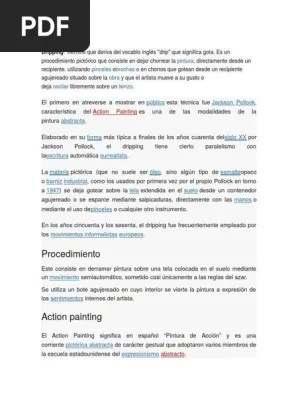 Dripping o action painting (en español «goteo o pintura de acción») es una técnica pictórica, así como el nombre del movimiento pictórico que la usa.surge en el siglo xx dentro de la pintura no figurativa... Dripping o action painting (en español «goteo o pintura de acción») es una técnica pictórica, así como el nombre del movimiento pictórico que la usa.surge en el siglo xx dentro de la pintura no figurativa. Desde el punto de vista técnico, consiste en salpicar con pintura la superficie de un lienzo de manera espontánea y enérgica, es decir, sin un esquema … Movimiento pictórico surgido en e.u.a. Dripping o action painting (en español «goteo o pintura de acción») es una técnica pictórica, así como el nombre del movimiento pictórico que la usa.surge en el siglo xx dentro de la pintura no figurativa.