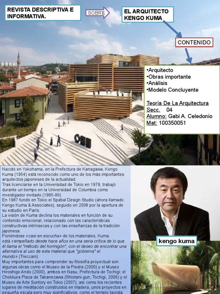 Otro de los factores que resaltan en la arquitectura de kuma es el innovador uso de materiales comunes que cobran un sentido especial y único al ser utilizados en sus obras... He established kengo kuma & associates in ….. Otro de los factores que resaltan en la arquitectura de kuma es la innovadora manera de utilizar los materiales que todos conocemos.